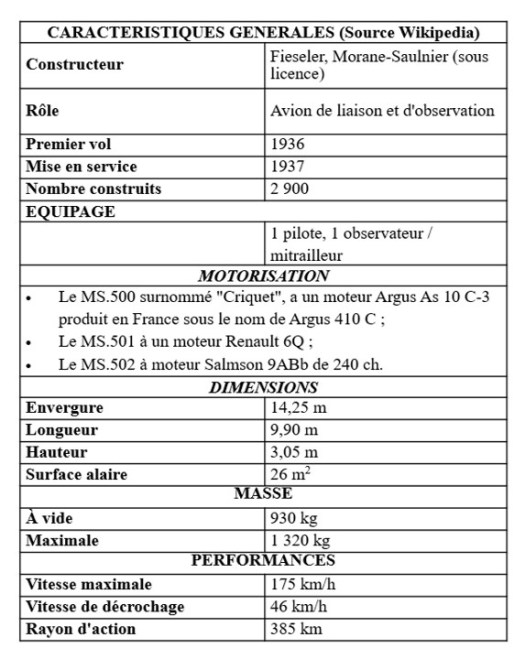 MS 501, MS 502 et MS 503 sont les appellations données au Fieseler Fi 156 Storch allemand construit sous licence en France durant l’occupation et après guerre par les usines Morane-Saulnier de Puteaux. La différence entre les trois modèles se trouve au niveau de la motorisation. au début de la guerre d’Indochine, cet avion de liaison et d’observation était aussi utilisé pour l’évacuation de blessés.