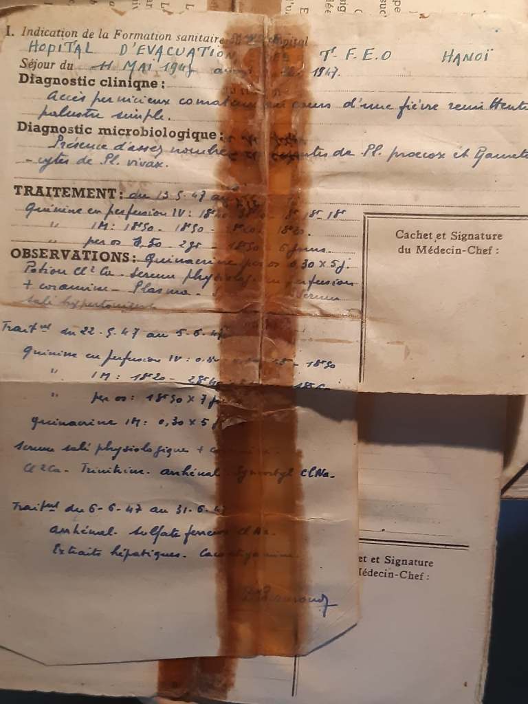Fiche d’évacuation sanitaire du Chasseur MOREL de la 2ème Cie du 1/1 RCP évacuer de Hoa Binh le 11 mai 1947, juste avant les Casseurs Emery et Chevalier (Photo Morel)