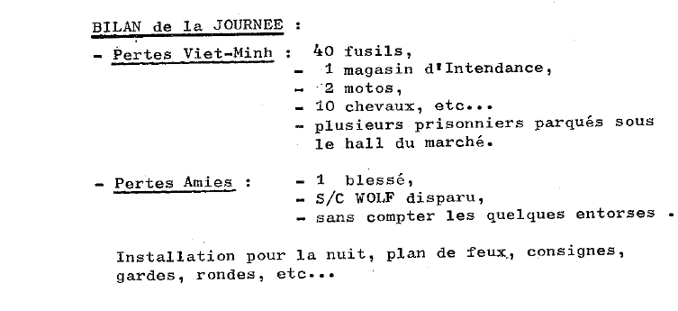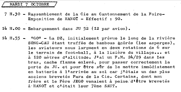 » Le 6 octobre nous recevons l’ordre de préparer nos sacs marins, de les stocker au magasin de la compagnie et de faire notre sac à dos avec les effets qui pourront être utiles pour notre opération. On nous demande aussi de vérifier notre arme et les munitions afin de contrôler si tout fonctionne et si tout est au complet. Le 7 octobre 47 au réveil, mon chef de section rassemble les chefs de groupes, et nous apprend que c’est aujourd’hui le jour J. Dans l’après midi il donne les dernières recommandations pour le regroupement au sol et les missions que nous avons à remplir. L’après midi nous touchons un repas froid, il faut manger le plus rapidement possible car les camions nous attendent pour nous emmener au terrain d’aviation.
