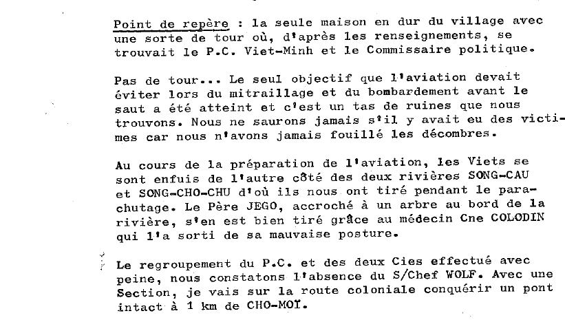 15H00 : au 2ème coup de sonnette la première vague se précipite dans le vide. Je suis deuxième derrière le sergent Legal. Nous qui étions du 2ème largage, nous nous penchons tous les 2 à la porte pour voir s’il n’y a pas d’accident. Tout s’est bien passé les parachutes se sont ouverts. L’avion fait un tour, nous accrochons nos static lines et nous nous mettons en position de départ. Je suis 2ème à la porte, je vois très bien le terrain d’atterrissage, c’est très scabreux. Il y a des bambous à chaque extrémité de la DZ: mais peu importe nous sommes parachutistes et rien ne nous arrête. Au 2ème coup de sonnette je m’élance dans le vide. Ouf mon parachute s’est ouvert. J’essaie de me dégrafer pendant la descente. Je n’ai pas fini d’enlever le mousqueton de mon ventral que je suis obligé de me mettre en position d’atterrissage et…. sans aucun mal je passe à travers un arbre et arrive comme une masse sur un radeau en bambous à trois mètres du bord. Sur l’embarcation, quelques femmes, des enfants et 3 hommes qui avaient peur de cette invasion traversaient le fleuve pour aller se cacher dans la montagne. La plupart effrayés se jettent à l’eau., Je suis seul avec un nha-que ( paysan ) parlant très bien le français. Ayant quitté mon parachute, j’arme ma mitraillette et donne l’ordre au paysan de conduire le radeau vers le rivage. Je rejoins par la suite le point de regroupement où je dois retrouver la section. Tout s’est bien passé pour moi. Malheureusement il manque un sous officier à l’appel. On le retrouvera 3 jours après, noyé dans le fleuve . Toute la compagnie est regroupée en moins d’une heure. La 1ère section et la mienne ont pour mission de pousser une pointe vers un important pont, après avoir fait un nettoyage ; la 1ère section l’occupera pour la nuit. Nous progressons colonne par un, mitraillette et fusil à la main, prêt à toute attaque Viet-Minh. La route est très encaissée, bordée par deux montagnes boisées. Il y a de jolis coins pour tendre des embuscades. Nous arrivons au pont. Il était temps, les pirates avaient déjà préparer l’emplacement de l’explosif pour le faire sauter, 1/2 heure de plus leur aurait suffi. Un petit nettoyage autour du pont et notre section rentre à Cho Moï et s’installe tant bien que mal avec les moyens de fortune pour la nuit.