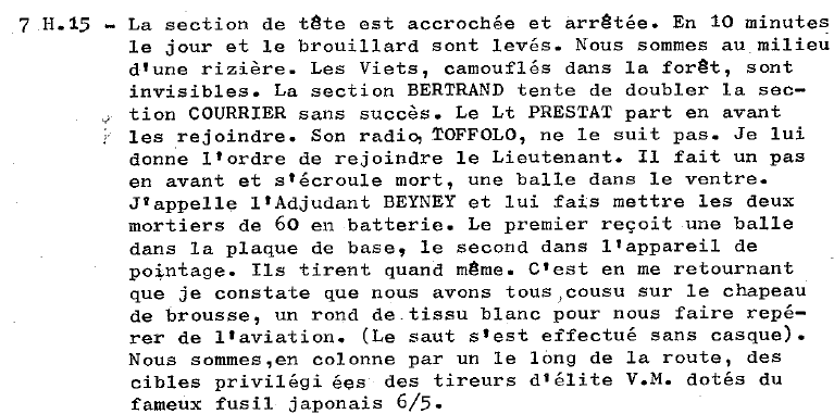 Les deux pièces de mortier de 60mm sont touchées par des balles, le feu continue toujours ajusté du côté VM. La section du sous-Lieutenant BERTRAND amorce quand même un débordement par la droite. Elle est clouée au sol au bout de 150m par des armes automatiques tirant de Ban Tinh. Le Sous-Lieutenant BERTRAND commandant sa section debout sous le feu est tué de 4 balles dans le corps. Le sergent CAZAMAREC est également tué ; 8 hommes sont blessés.