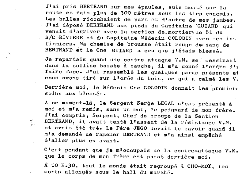 L’affaire de Cho Don s’est bien terminée. L’adversaire a été complétement surpris par la rapidité de notre action. Témoin, un Chasseur de la 9èmr Compagnie qui arrivant en parachute sur le dos d’un VM, l’étourdit sous le choc et abat à la mitraillette un autre VM qui s ‘enfuyait à toutes jambes. Les cadavres ennemis sont restés sur le terrain. Un lot de munitions d’artillerie a été récupéré. Les documents saisis indiquent qu’un PC de bataillon était installé à cet endroit. Les pertes amies sont nulles