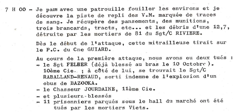 01h15 : Retour de l’embuscade tendue par la 12ème Compagnie. Elle a été fructueuse. La surprise a été totale pour l’adversaire qui a eu 7 tués dont un commissaire politique. Un fusil Remington de 8mm a été récupéré.