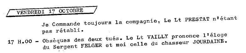 13h00 : La 10ème Compagnie et 1 pièce de 81mm, aux ordres du Lieutenant VAILLY, partent en reconnaissance dans la région mitraillée le matin par la chasse. Elle découvre dès le début du chemin qui déboire de la RC 3 vers la montagne, une tombe fraichement creusée, des galons. En progressant vers les villages, la reconnaissance trouve des emplacements de guetteur qui n’ont dû être évacués que le matin même. L’emplacement présumé d’une pièce d’artillerie de montagne qui a bombardé Cho Moï lors de l’attaque de nuit est décelé. Des poignards, des paquetages ainsi que des bambous pleins d’essence sont découverts.