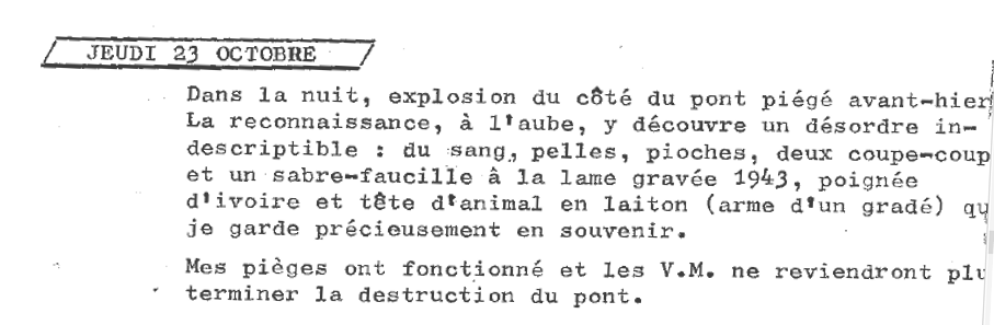 10h10 : La coupure est réparée. Pendant l’exécution des travaux, la section BILLAERT, envoyée en reconnaissance au-delà du pont, a été reçue par une arme automatique. Un guetteur VM est aperçu et blessé au genou. Il est capturé et son interrogatoire donnera des informations intéressantes.