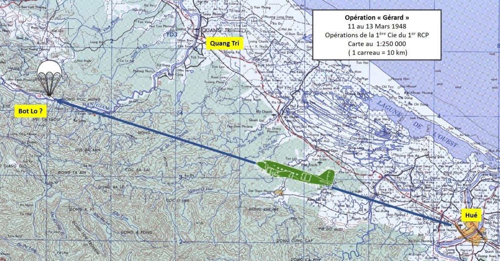 A signaler une innovation du Capitaine BASTOUIL qui, venu comme conseiller technique des TFCA (Troupes Françaises du Centre-Annam, n’a pu se résoudre à rester dans l’appareil. Le Capitaine largue son sac de montagne avec son ventral à 50 mètres du sol, et atterrit dégrafé, sa carabine à la main. Son sac est à 10 mètres de lui.