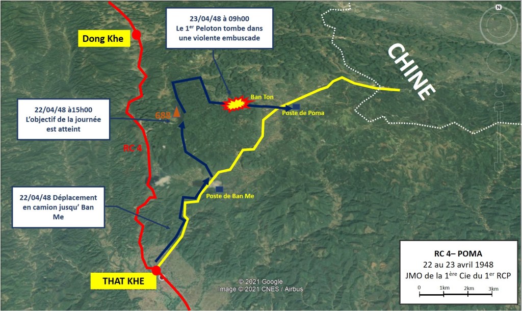 09h00 : A 500 m de Ban Ton, le 1er peloton engagé dans un col étroit entre des pitons rocheux tombe dans une violente embuscade : explosions de mines et de grenades, vive fusillade. Le 1er Peloton réagit vite et musèle les Viets avec l’appui des feux du 2ème Peloton et du mortier de 60mm de la Compagnie. Les rebelles ont perdu 20 tués dont un chef de section, un mousqueton, de nombreuses munitions et des documents. De notre côté, un coolie a été tué, 4 chasseurs et un partisan très légèrement blessés :