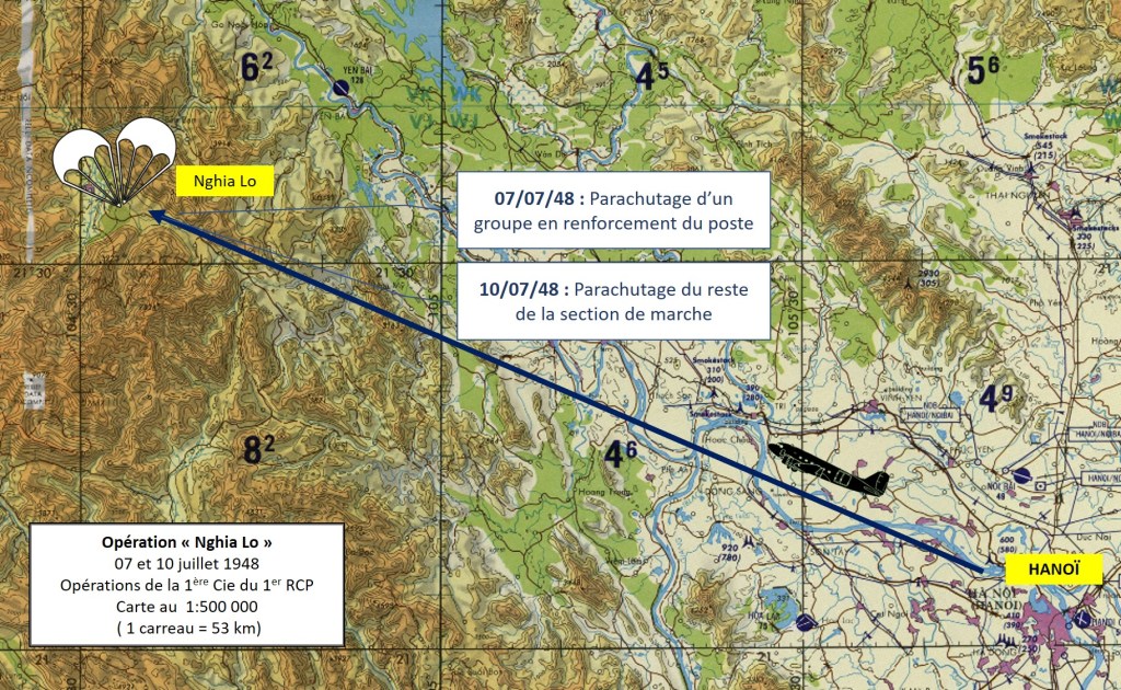 Départ et saut sur le terrain de Nghia Lo du Lieutenant ROUQUETTE, officier de liaison, et du 1er Groupe. Le Commandant HEBRARD, prenant le GLAP et le Capitaine DECAILLY les accompagnent et reviennent le jour même.