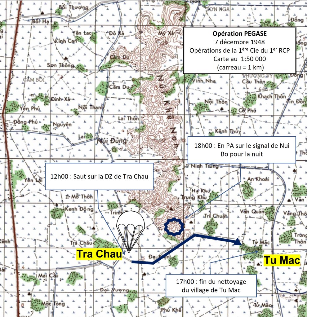 11h30 : Les avions décollent. Le vol dure 40 minutes. Le Bataillon a pris place dans 17 JU52 qui volent en formation par 3. Le spectacle est très spectaculaire. La DZ (dropping zone = zone de saut) se trouve près de Tra Chau, à une dizaine de kilomètres au Sud de Phu Ly. Le saut est normal, mais l’atterrissage provoque de la casse, le sol étant très dur. Le regroupement est ralenti par la récupération des gaines.
