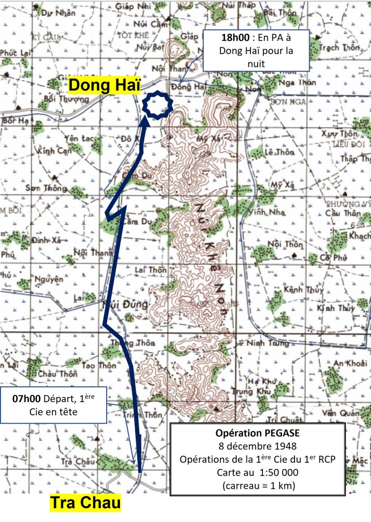 07h00 :Un groupement de 2 compagnies (1ère et 4ème) doit fouiller le Nui Khe Non, montagne située au Nord de la DZ. Le départ s’effectue le long de la digue qui suit le flanc Ouest du Nui Khe Non. La Compagnie est en tête. Il n’y a pas d’incident. Le groupement atteint Doan Haï au Nord du Nui Khe Non à 10 km au Nord-Est de Tra Chau et s’y arrête pour la nuit. Durant la nuit, de nombreux indices signalent d’importants mouvements dans le secteur. Nous recevons quelques rafales d’armes automatiques et quelques VB*. Nous saurons le lendemain ce qui s’est passé.