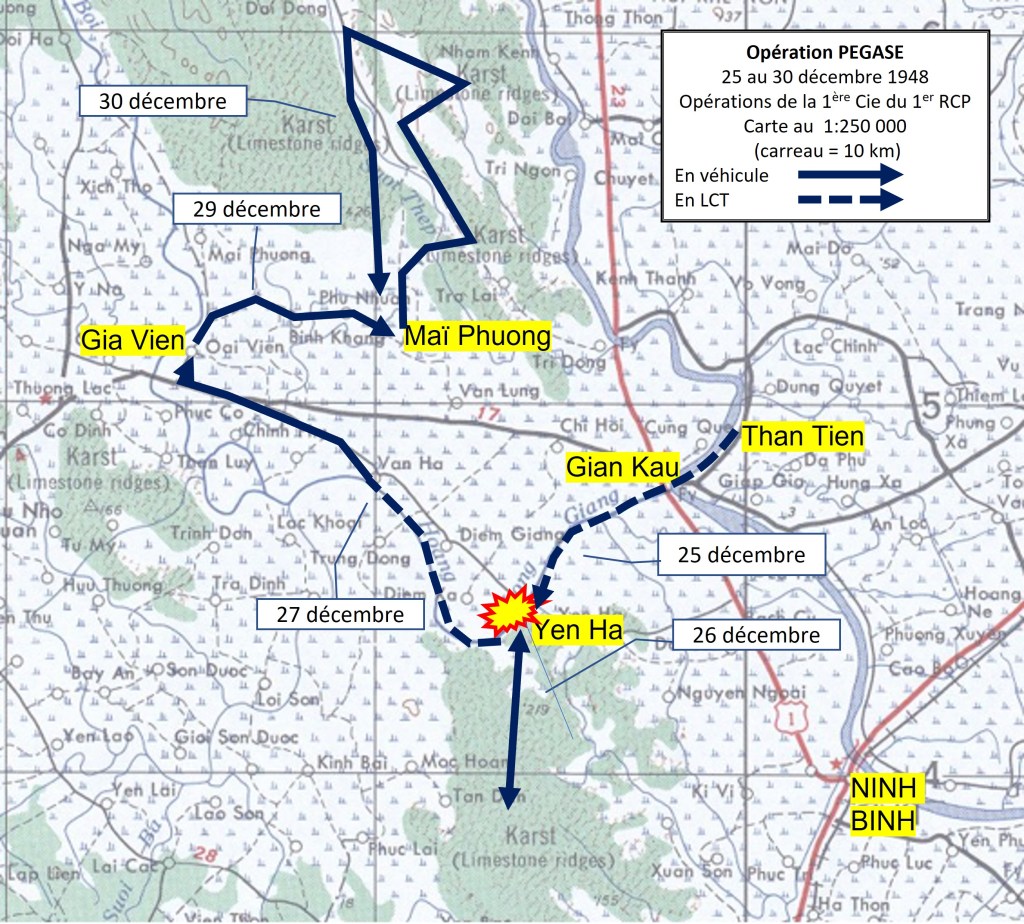 La Compagnie effectue la mission habituelle de fouille et de grenouillage dans la région au Sud de Ninh Binh sur le trajet Gian Kan – Ninh Binh en LCT. Le Bataillon débarque aux rochers de Ninh Binh. La Compagnie par en têtes sur la Route Coloniale 1 (RC1) parallèle à la voie ferrée, vers le Sud. Arrivée au pont de Cau Yen, la Compagnie s’y installe pour la nuit.