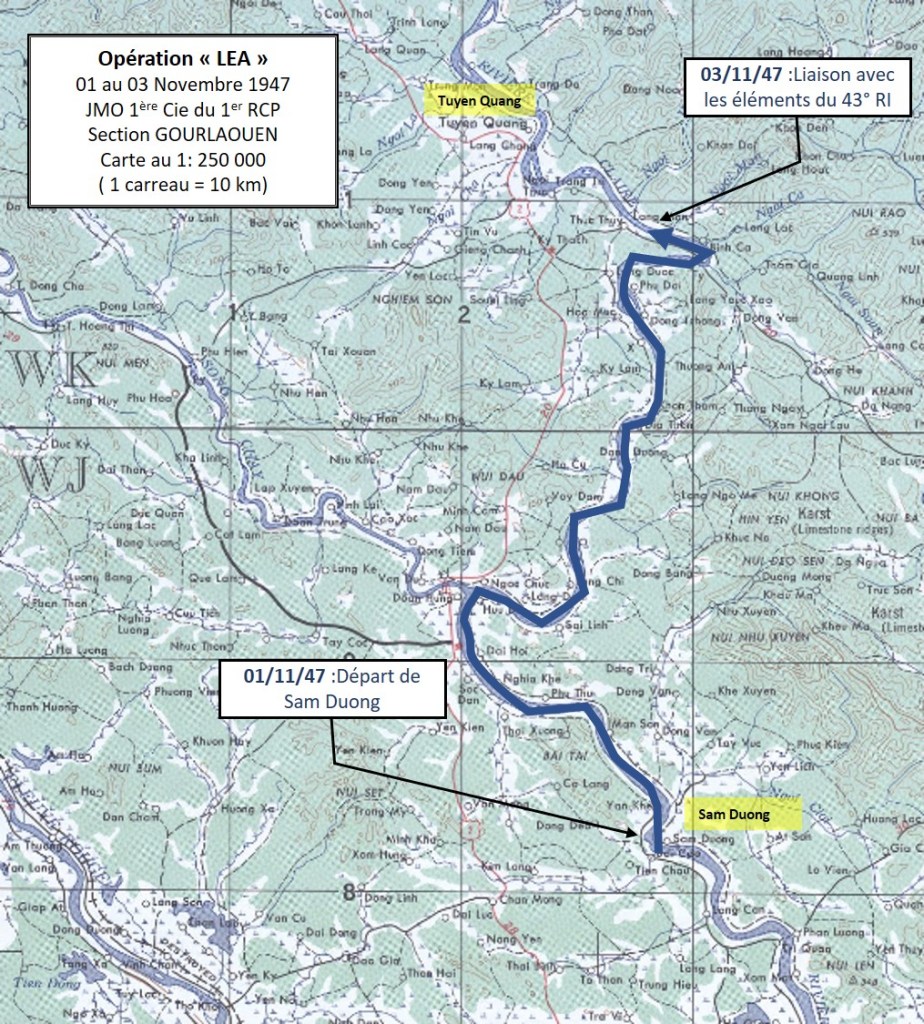Section GOURLAOUEN : itinéraire Sam Duong -Phu Doan. La section marche avec la Compagnie BIRAUD du 43ème RI. Ordre est donné à l’Aspirant GOURLAOUEN de remonter à Tuyen Quang en escorte de convoi maritime.