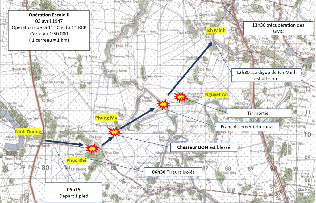 Le 1er peloton mettant son lance-grenade (LG) en action fait décrocher la résistance. La Cie passe le canal dans des barques récupérés par des nageurs pendant que le mortier envoie quelques obus sur Nguyet Anq d’où des tireurs tentent de gêner la traversée.