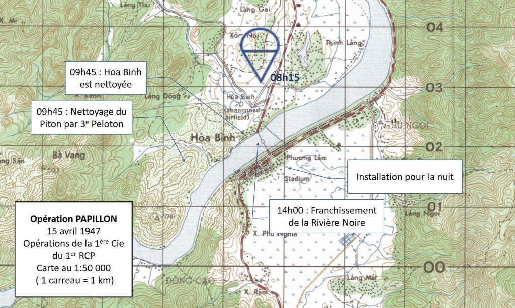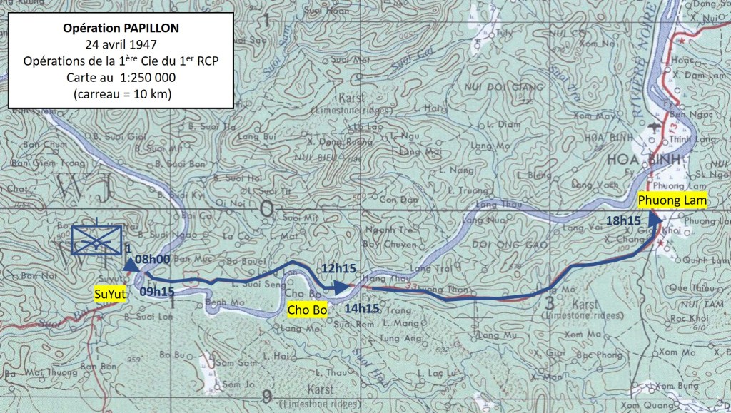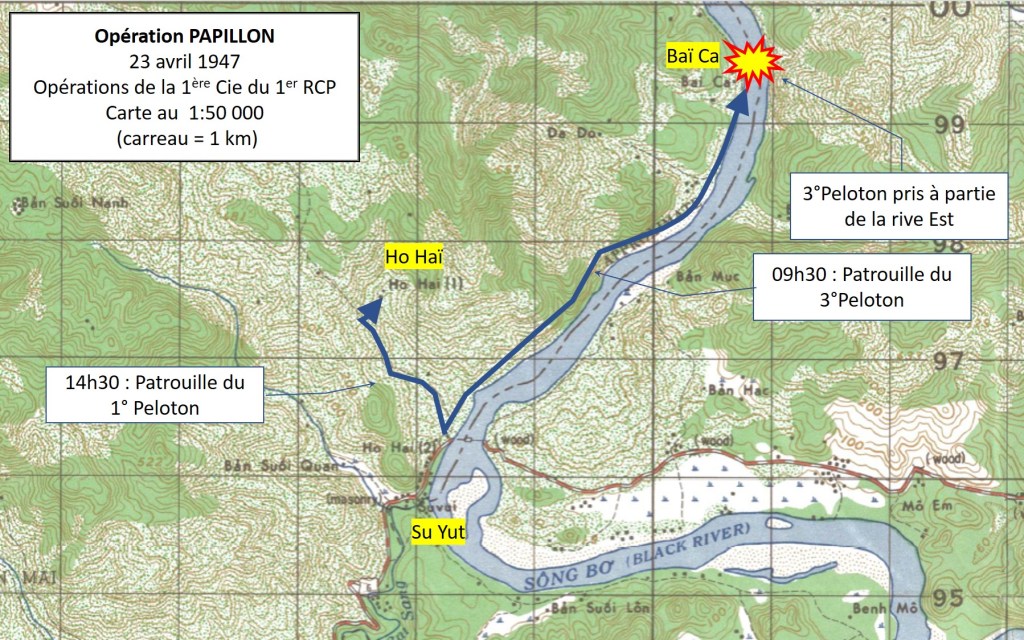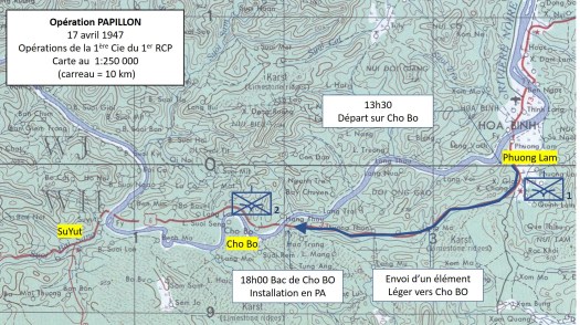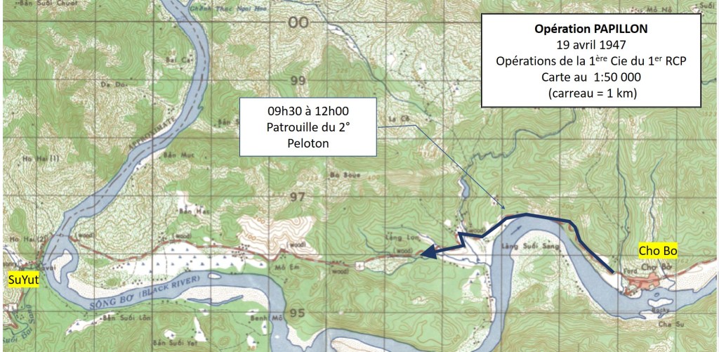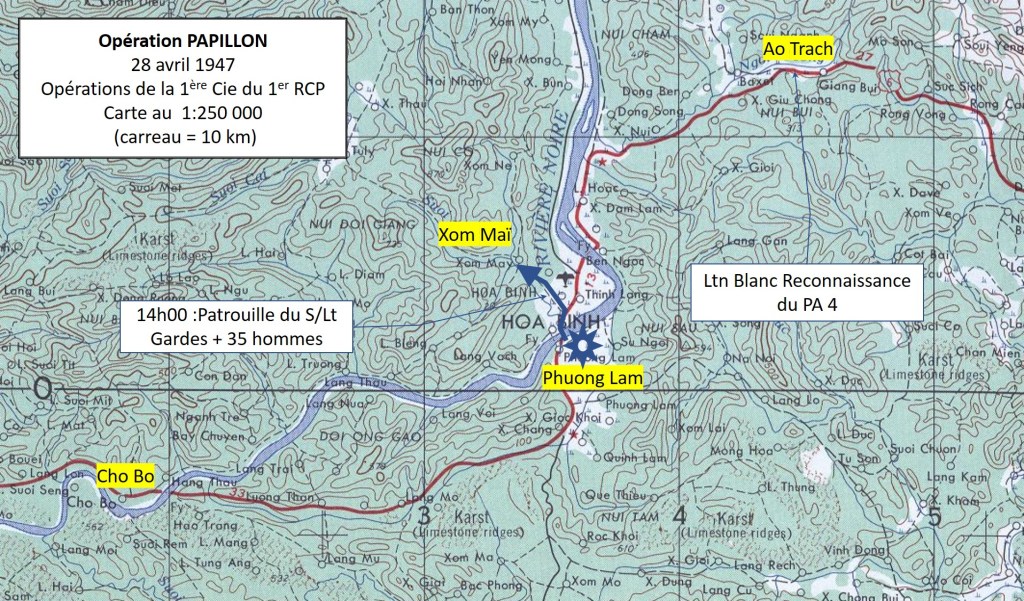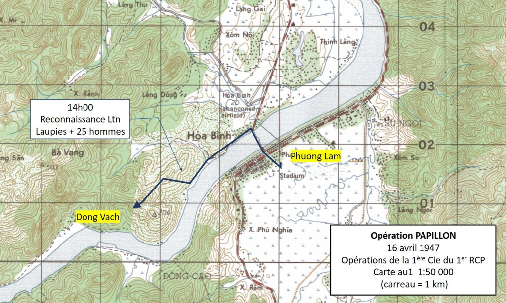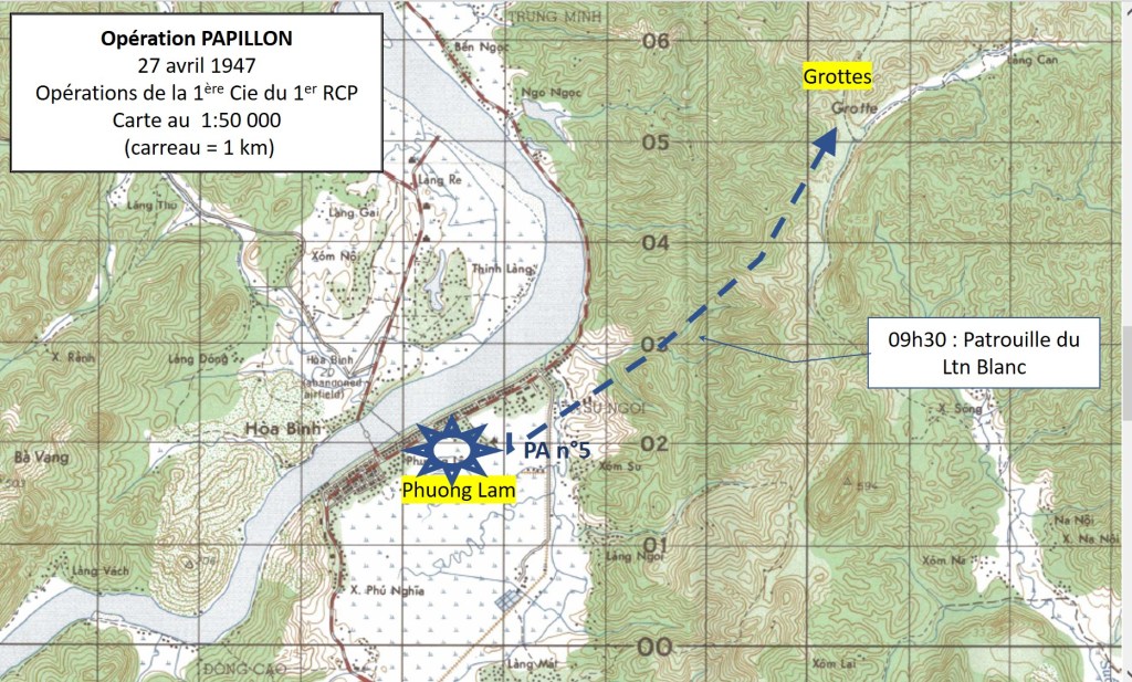 14h00 : Patrouille de reconnaissance : 2ème et 3ème Pelotons, Groupe de commandement. Chef de Patrouille : Ltn Blanc. Mission : reconnaitre l’itinéraire menant à des grottes à 6 km Nord-Est de Phuong Lam. Faire jonction avec des éléments de la CB1 venus par un autre itinéraire.