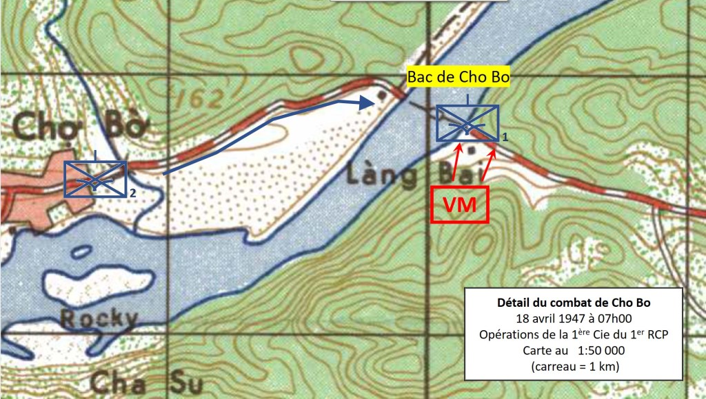 07h00 : La Cie s’apprête à passer la Rivière Noire. Elle est brutalement prise à partie par des feux violents de fusils et de VB provenant des rochers en surplomb. Nous ripostons mais en quelques minutes, à terre sur le chemin et sur la plage dans le sampan où s’embarquait le 1er Peloton nous 1 tué ( Sergent Leclère du 3ème peloton) et des blessés :