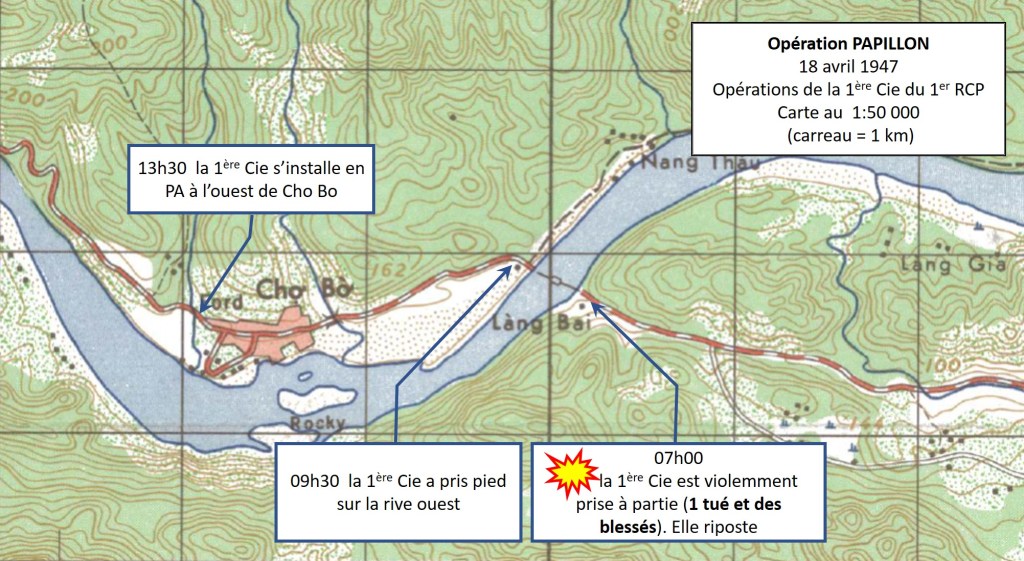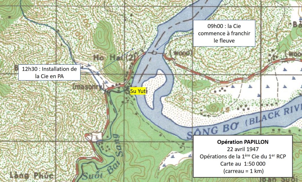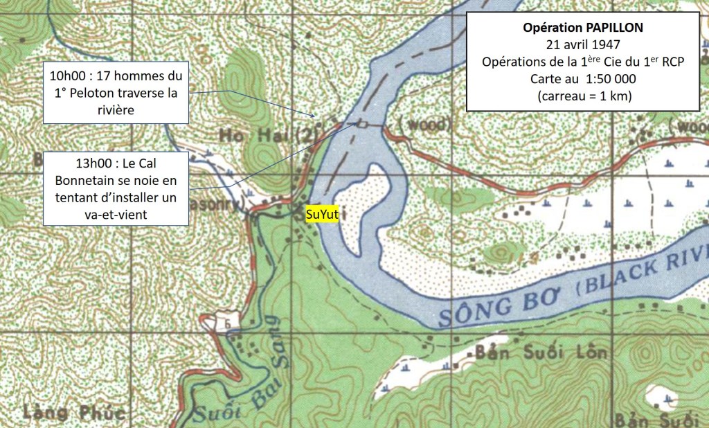 10h00 : Récupération d’un radeau et d’une barque sur la berge de Maï Chau (nageurs). Impossible de repasser le radeau. 17 hommes du 1er Peloton ( Sous-Lieutenant Gardes) passent la rivière sur la barque et s’installent en PA sur la rive gauche.