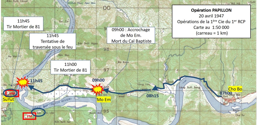 09h00 : Accrochage à Mo Em. Les VM tirent de très loin. Nous ripostons au mortier de 81 Le Caporal Baptiste Robert, du 1er Peloton est tué à 09h30, d’une balle au cœur. Les Pelotons Gardes (à droite) et Gourlaouen ( à gauche) avancent.