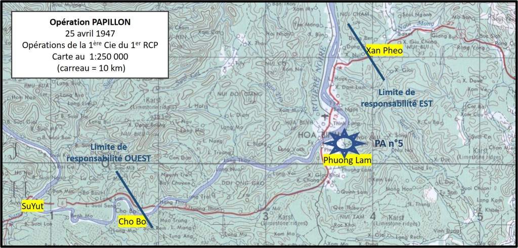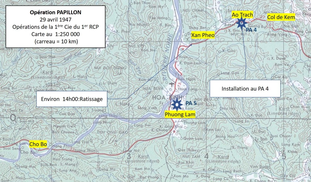 13h00 : Départ de Phuong Lang, par camion, d’un premier élément de la Cie ( Ltn Blanc , 1er et 3ème Peloton) qui opère un ratissage de chaque coté de la route à Xan Pheo, lieu d’une embuscade Viet-Minh le 29 avril 47 à midi : RAS.