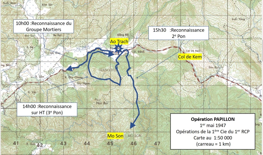 Moyens : aux ordres du Commandant de Vismes, un groupement comprenant des éléments FV (forces vives) et CB (compagnie de base ?) du 1er RCP, 1 barque à moteur, 1 batterie d’artillerie,1 pièce de 81.