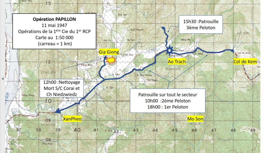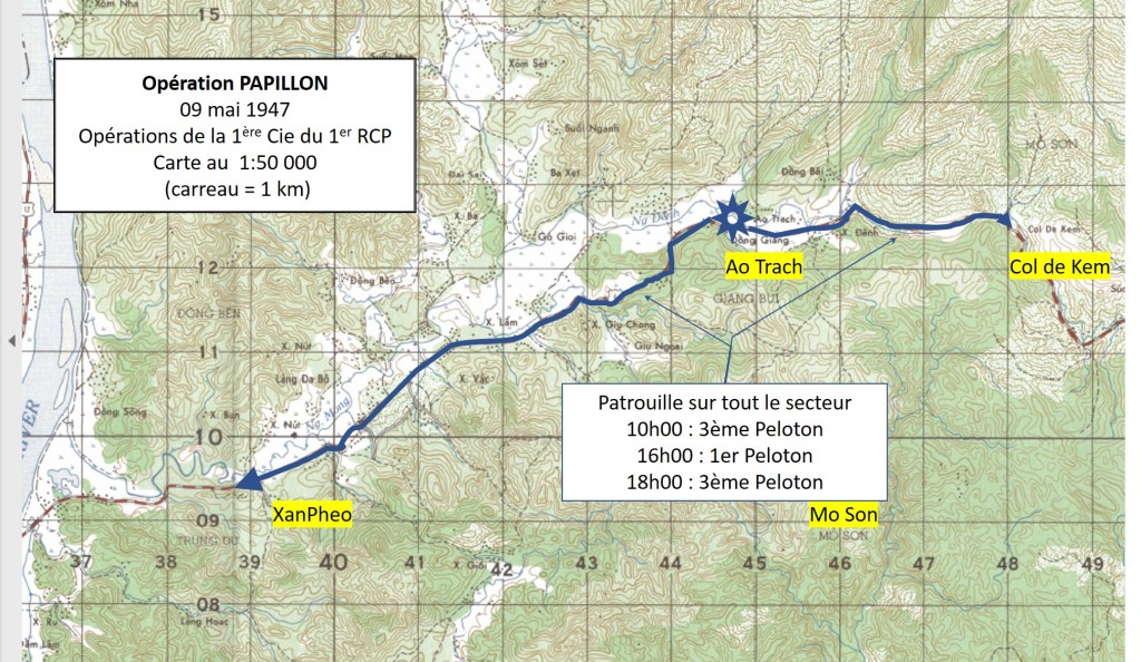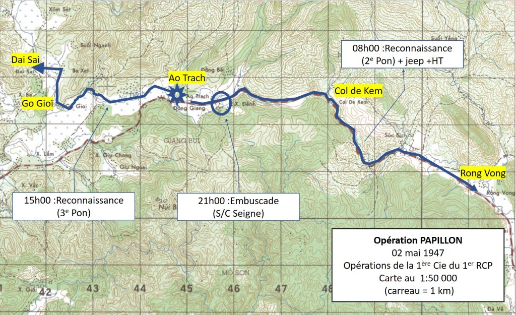 08h00 : Patrouille 12 hommes du 2ème Peloton avec 1 jeep et 1 Half Track (Lt Blanc). Reconnaissance de zones favorables aux embuscades Viet-Minh jusqu’à la coupure de Rong Vong ( 9km à l’Est d’Ao Trach).