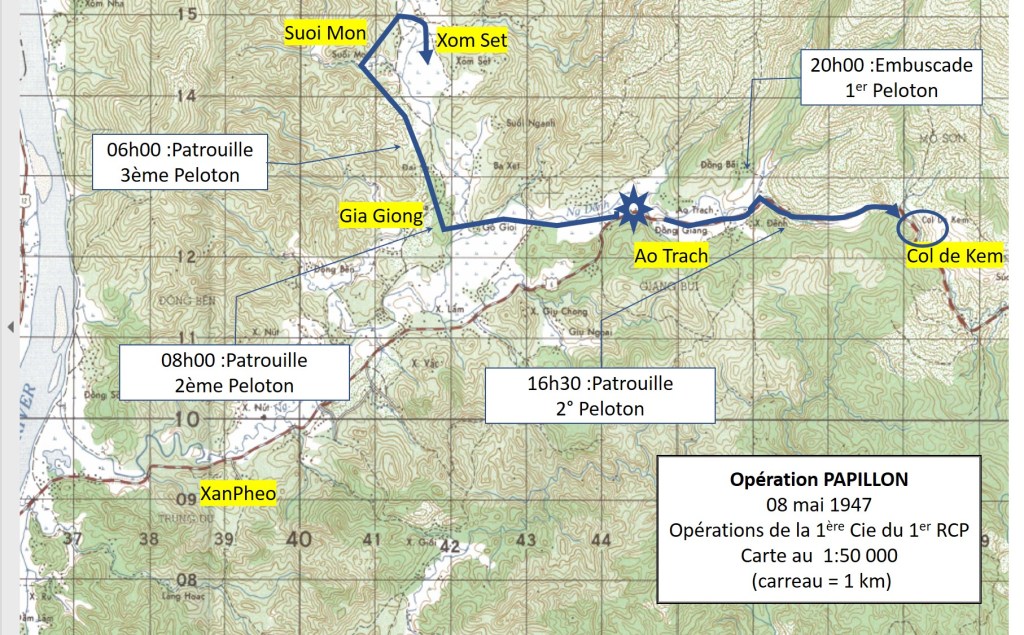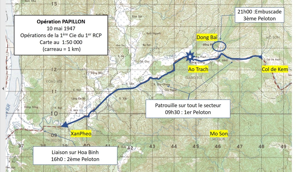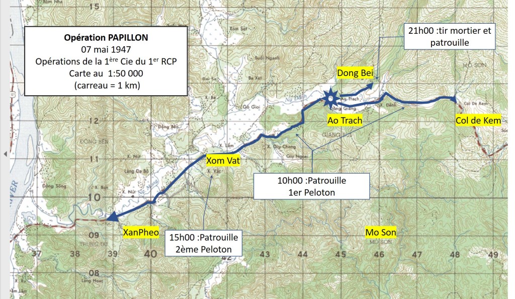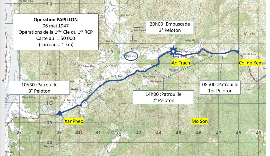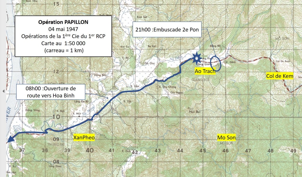 21h00 : Embuscade 5 hommes du 1er Peloton (Chef Seigne) à l’issue du sentier venant du Sud, à 2km Est d’Ao Trach
