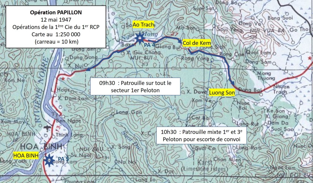 10h30 : Patrouille avec 8 hommes du 1er Peloton et 10 hommes du 3ième peloton sur 1 HT et 1 GMC aux ordres de l’Asp Gourlaouen. Mission : convoyer des véhicules venant de Hoa Binh jusqu’à Luang Son.