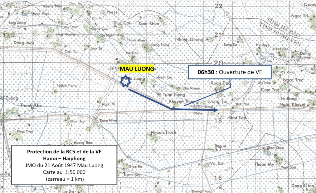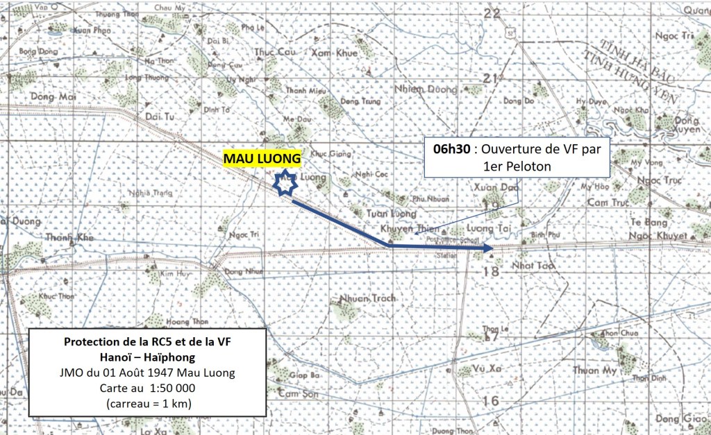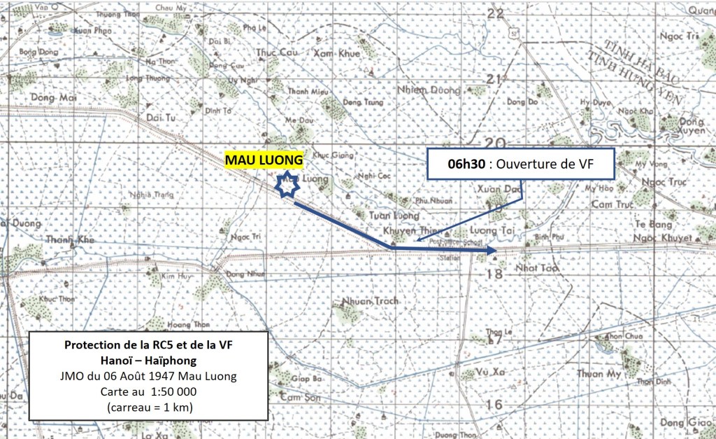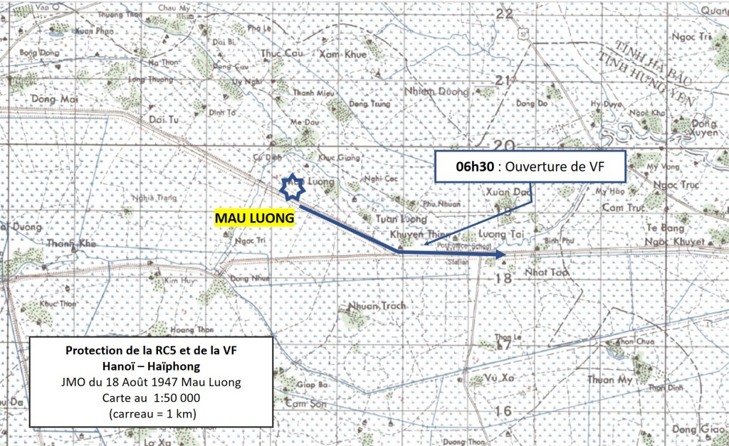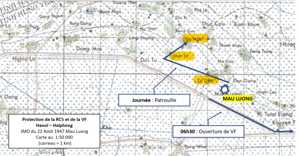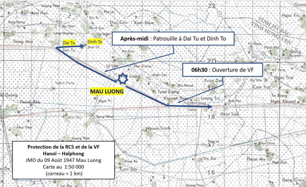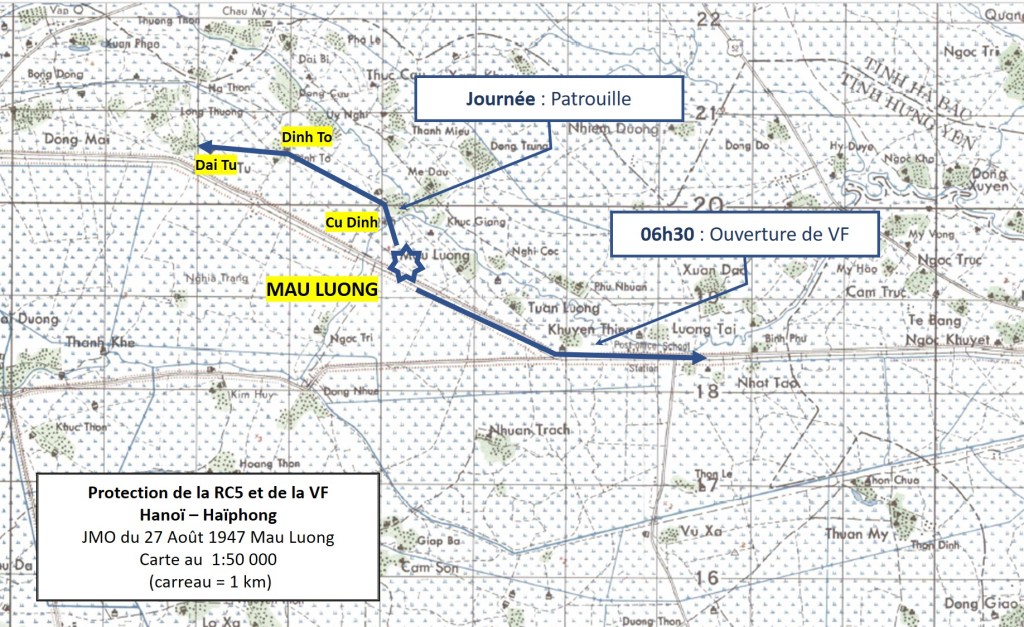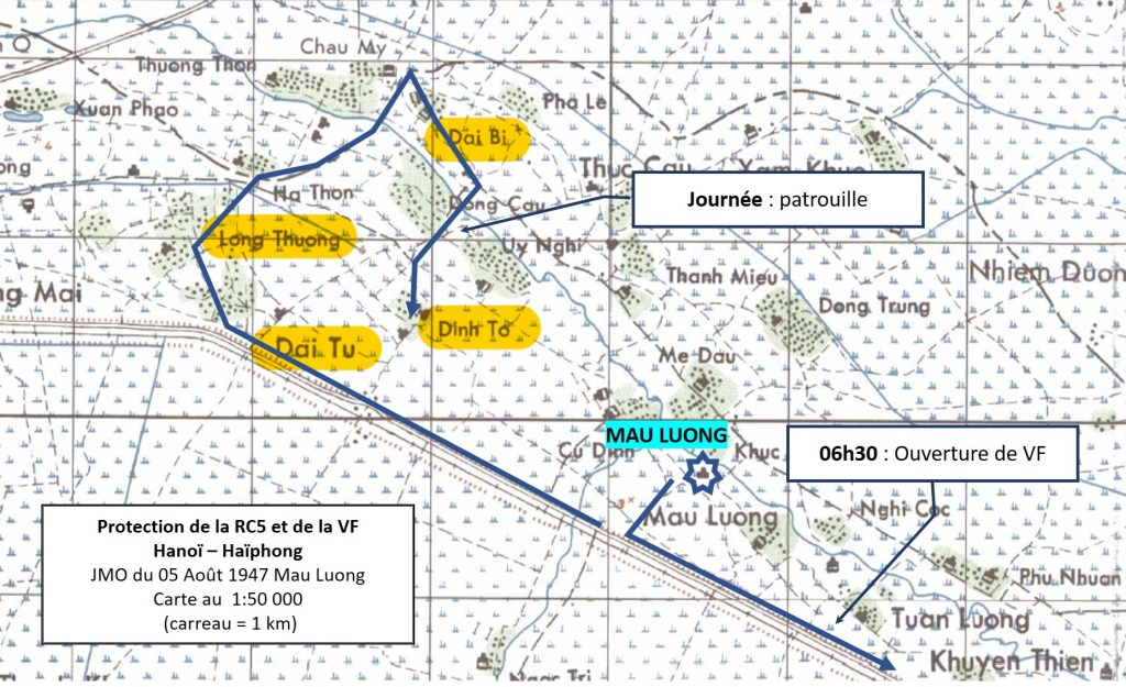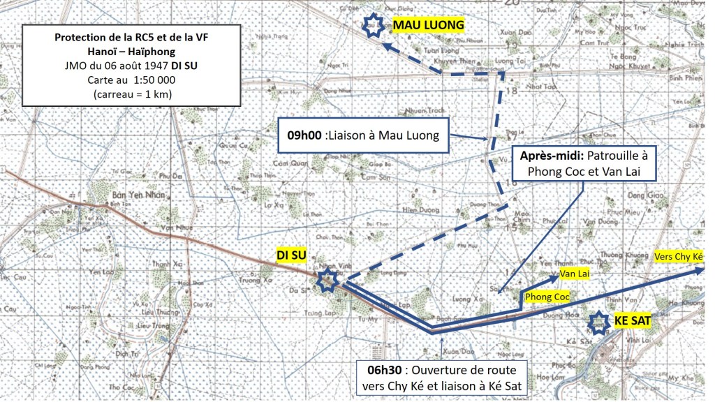 - 06h30 à 09h30 : Patrouille d’ouverture de la route : La patrouille est légérement accrochée par des fusils au niveau de Mai Dien. La riposte met en fuite les tireurs.