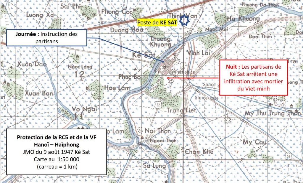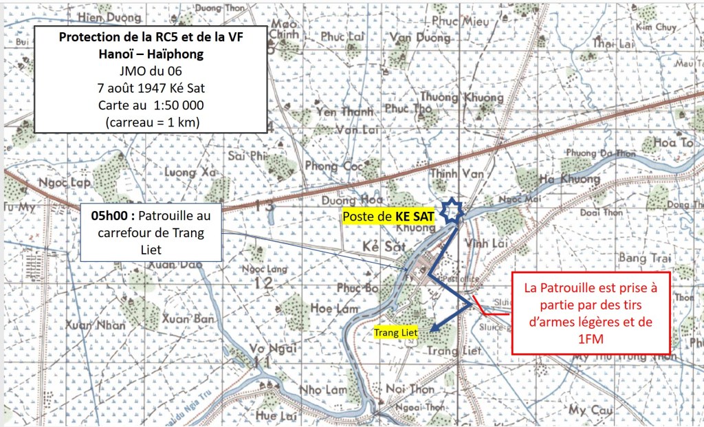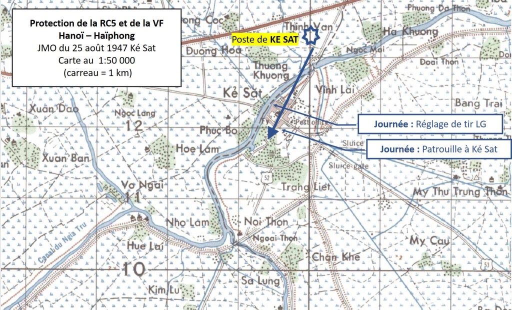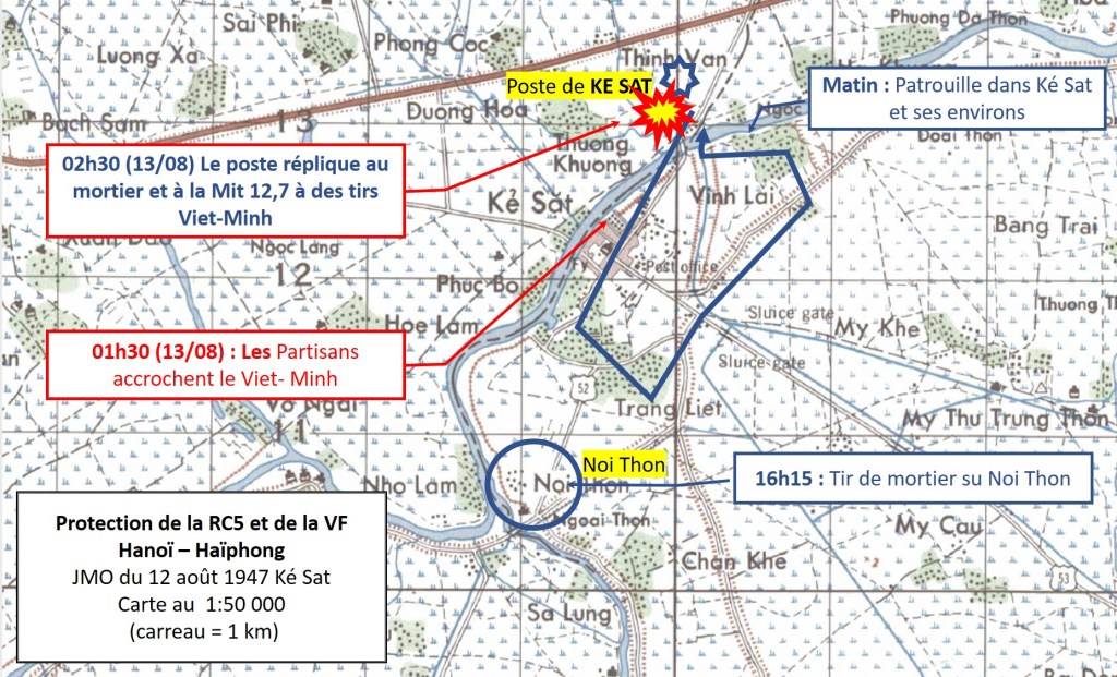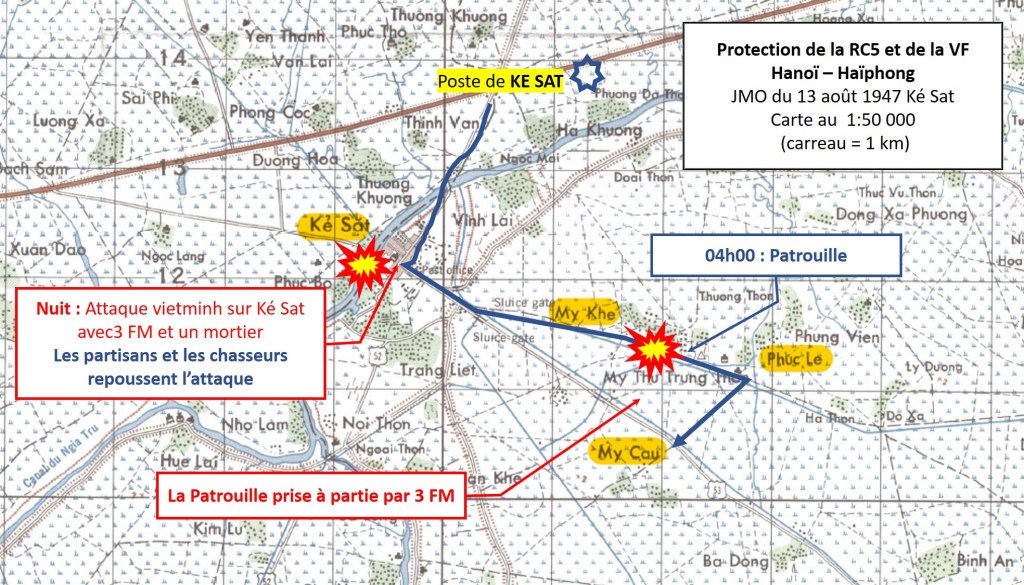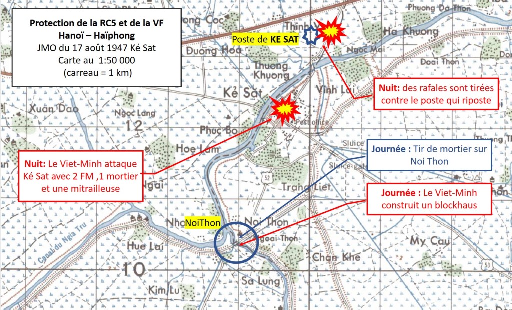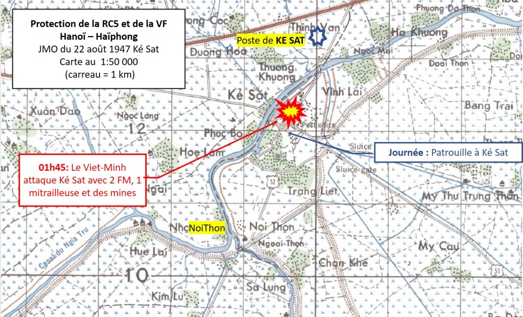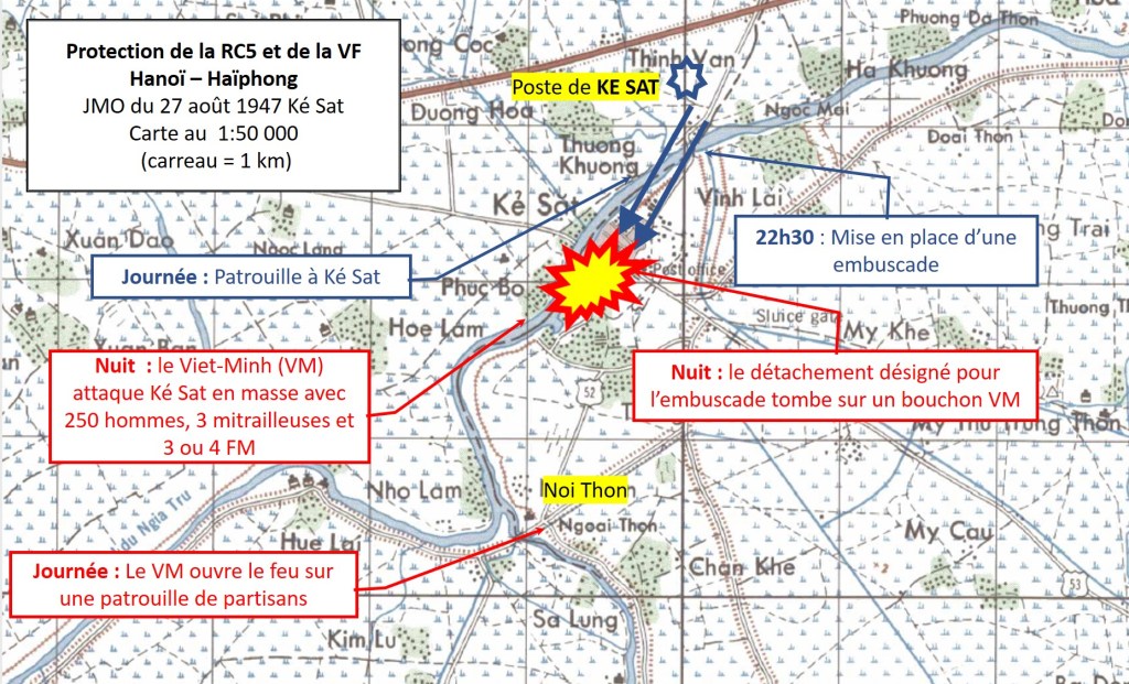 - Embuscade à Ké Sat : La patrouille ( 30 hommes aux ordres du Lieutenant Laupies) quitte le poste à 22h30. A l’entrée de Ké Sat, elle se heurte à un bouchon Vietminh se mettant en place. Deux Viet-minhs sont tués et un fusil est récupéré. La patrouille continue à avancer dans la ville et se heurte à un fusil-mitrailleur qui prend la grand rue en enfilade. Il apparait bientôt que l’embuscade de la compagnie correspond à une attaque en masse de la ville par le Viet-Minh. Le déclenchement du feu sur la piste, sur la cathédrale de Ké Sat, et sur la patrouille qui se repliait ( l’embuscade n’avait plus d’intérêt), a permis d’estimer les forces et l’armement adverse à : 2 mitrailleuses de 12,7mm, 1 mitrailleuse Hotchkiss, 3 ou 4 fusils mitrailleurs et environ 250 hommes.
