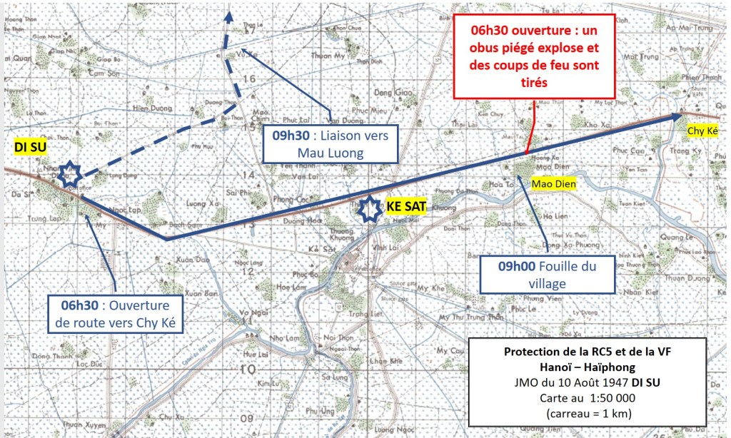 - 06h30 à 12h00 : Patrouille d’ouverture de la route : explosion d’un obus piégé à Mao Dien, suivie de coups de feu. pas de mal pour la patrouille. Le Lieutenant Lorrain (Dragon) va chercher du renfort au poste de Chy Ké. L’agglomération de Mao Dien est fouillée avec une patrouille de la 4ème compagnie se trouvant justement sur les lieux.
