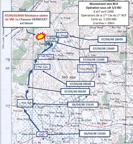 14h00 : La Compagnie reçoit l’ordre de se porter 1 km à l’ouest. Les rebelles qui occupent tous les pitons nous opposent une sérieuse résistance. Le chasseur HERMOUËT est grièvement blessé au ventre et est évacué par la section du 3/21ème RIC qui l’escorte jusqu’à Cao Nhat.